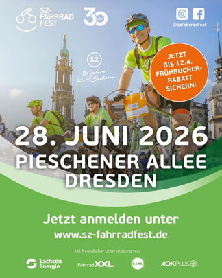 Sei dabei beim 30. SZ-Fahrradfest am 28. Juni 2026 und erlebe Dresdens größtes Rad-Event! Gestartet wird an der Pieschener Allee in Dresden – von hier aus führen dich fünf abwechslungsreiche Strecken durch die Region und wieder zurück ins Ziel. Ob Familienrunde, Genussfahrt oder sportliche Herausforderung bis ins Berliner Umland – du hast die Wahl.