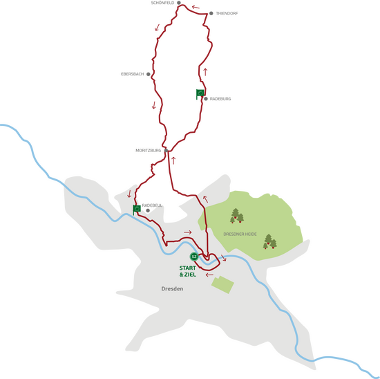 Gleich mehrere Teiche säumen den Weg der Radler, die sich für die zweitlängste Tour entscheiden. Über Boxdorf und Moritzburg gelangen sie zunächst nach Radeburg, wo sie sich für den weiteren Weg Richtung Norden stärken können. Besonders reizvoll ist dort der Abschnitt auf dem Damm zwischen Großteich und Breitem Teich: Zu beiden Seiten glitzern Wasserflächen, wiegt sich das Schilf im Wind. Den nördlichsten Punkt erreichen die Teilnehmer in Schönfeld, gelegen inmitten einer sanften Hügellandschaft und bekannt durch sein vielgestaltiges „Traumschloss“. Auf wenig befahrenen Straßen geht es über Ebersbach und Moritzburg wieder südwärts ins Elbtal; auf der Festwiese Radebeul lockt vor dem „Finale“ noch eine Rast.